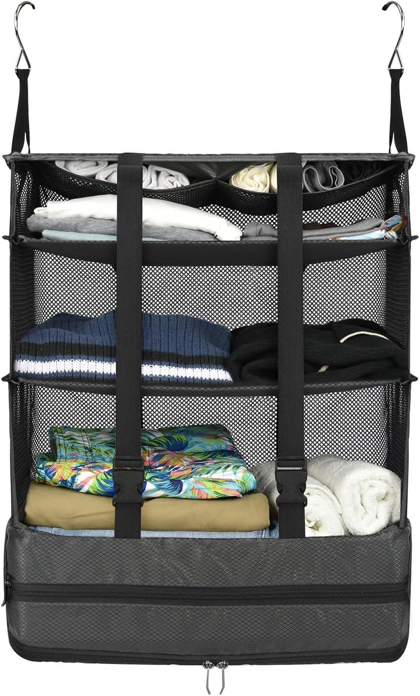 Streamline your packing process by neatly organizing your clothes into the hanging shelf and collapsing them into your luggage. When it's time to unpack, simply remove the hanging shelves and hang them in a closet or any convenient spot for easy access.