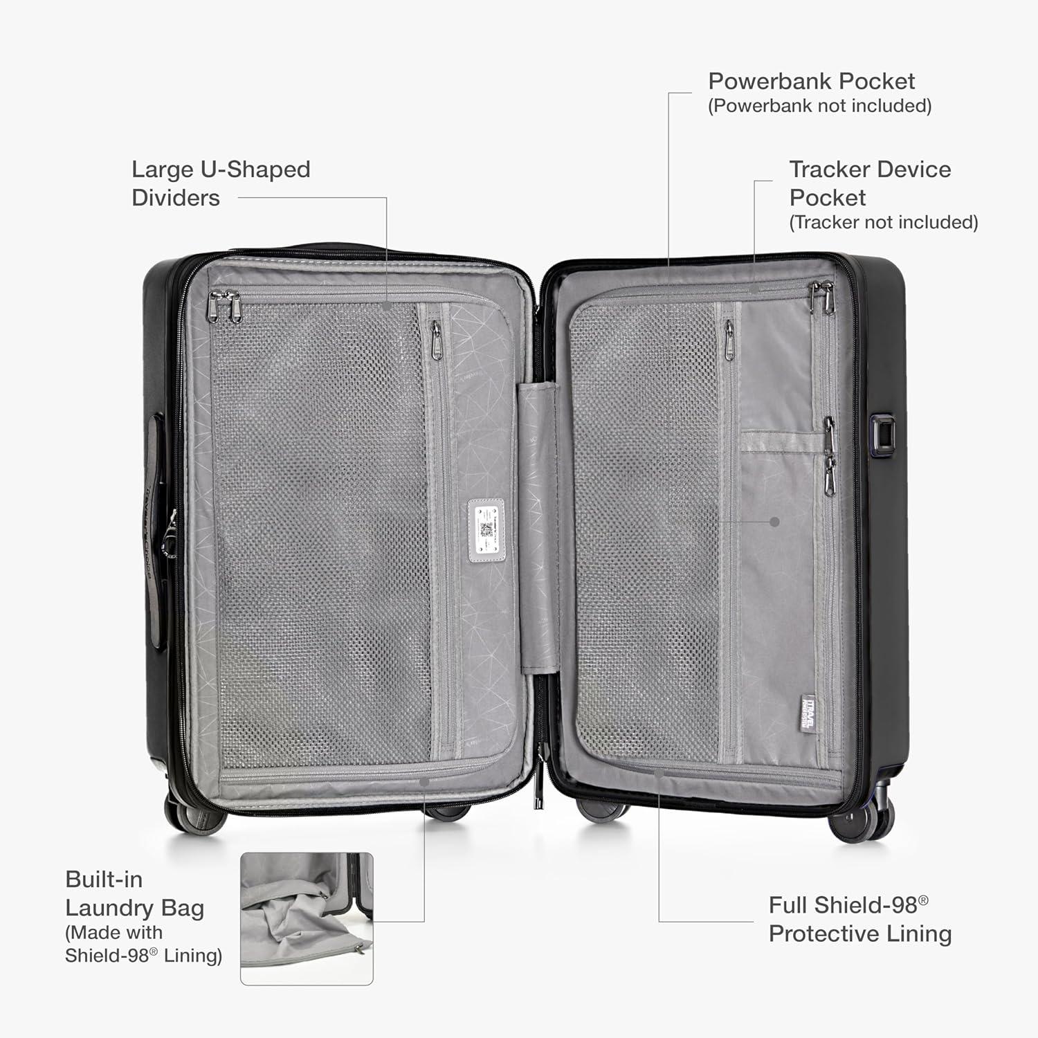 Traveler’s Choice Markham Hardside Carry-On combines durability, style, and convenience for frequent travelers. Crafted from impact-resistant polycarbonate, the sleek shell resists scratches and maintains its modern look trip after trip. Engineered for smooth mobility, the 360° double spinner wheels glide effortlessly across any surface, while the ergonomic telescoping handle ensures easy maneuvering through airports and busy streets. When you need extra packing space, the expandable design offers added capacity with a simple zip yet remains compliant with most airline carry-on size regulations. A TSA-approved lock keeps your belongings secure while allowing airport inspection without damage. Inside, the Markham features U-shaped zippered dividers for organized packing and a fully lined interior with Shield-98® protection, keeping your luggage fresh and clean after every trip. It also includes a laundry bag with Shield-98® for added convenience. With its durable build, smart organization, and travel-ready size, the Markham 21” Carry-On is the perfect companion for short trips or weekend getaways.