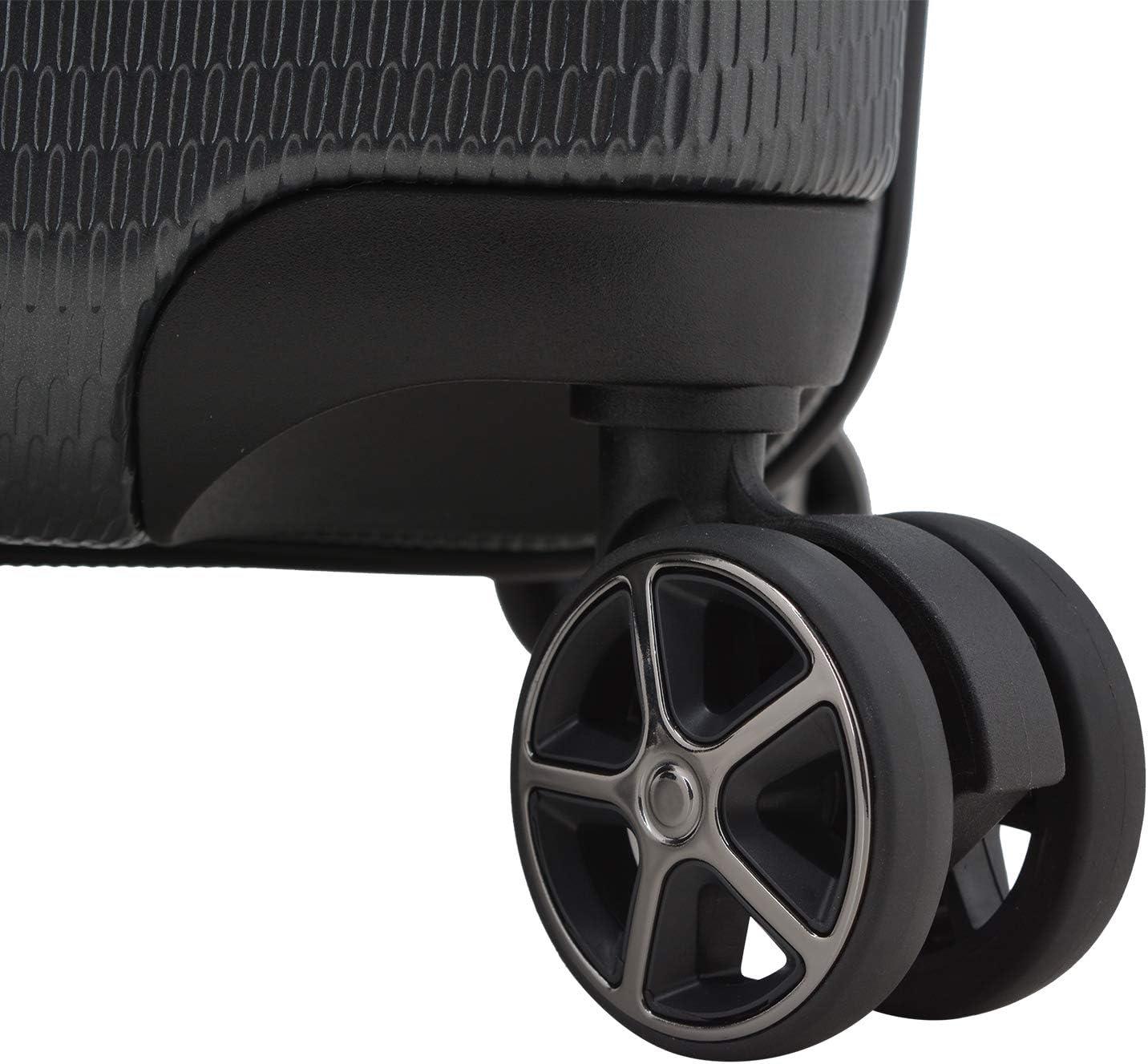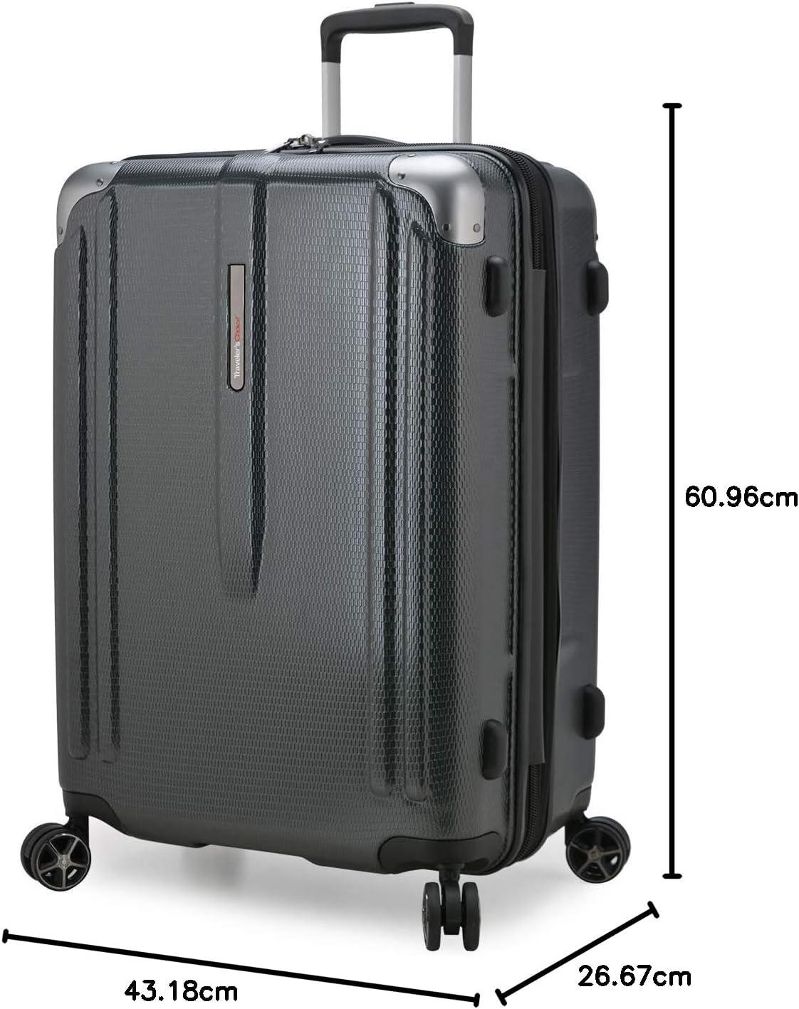Durable hard-shell construction with riveted corner guards offer great protection. Textured finish prevents abrasive scratches and finger prints. Aluminum telescopic handle system with push-button mechanism provides easy maneuverability. 360-Degree spinner wheel system provides wide wheel base for better traction and stability. 10 Main zipper makes opening and closing a breeze. 2-Inch expansion gusset allows 25 percentage more packing capacity. Main compartment features a claim-shell opening. Interior includes cross-tie straps, zippered divider, and pockets for extra storage. 22” carry-on spinner overall Dimension: 21.5”H x 14”w x 9.5”D + 2” expansion packing capacity: 20”h x 14”w x 9”d + 2” expansion linear inches: 45 weight approx. 7.47 lbs.