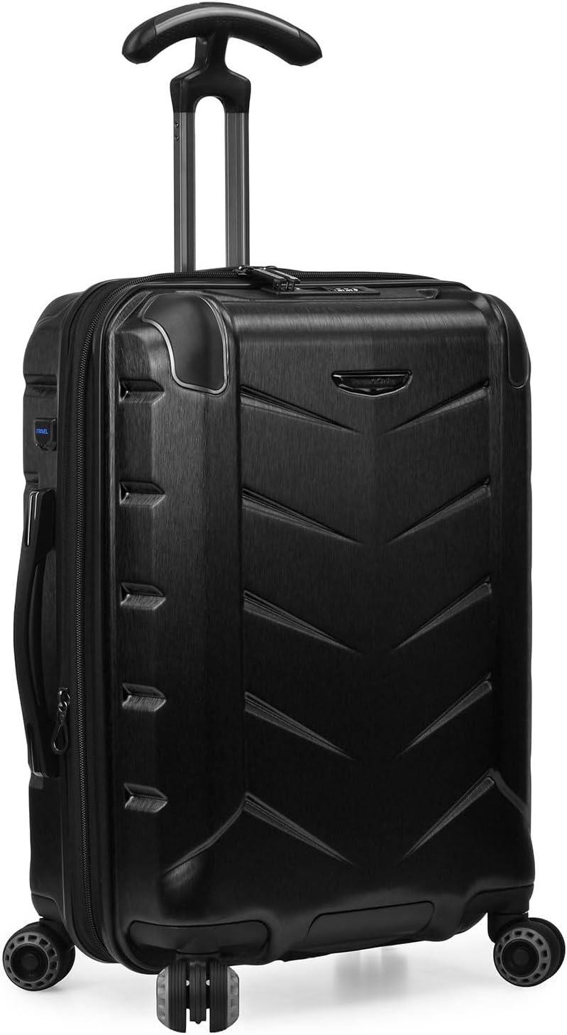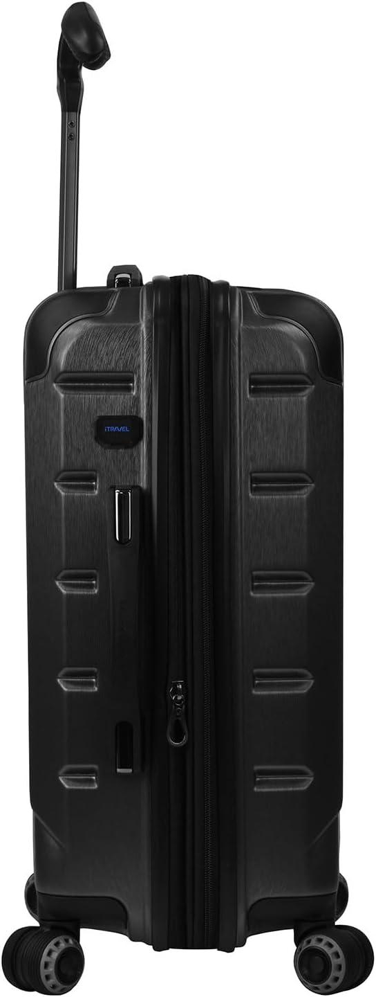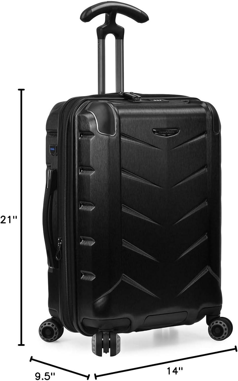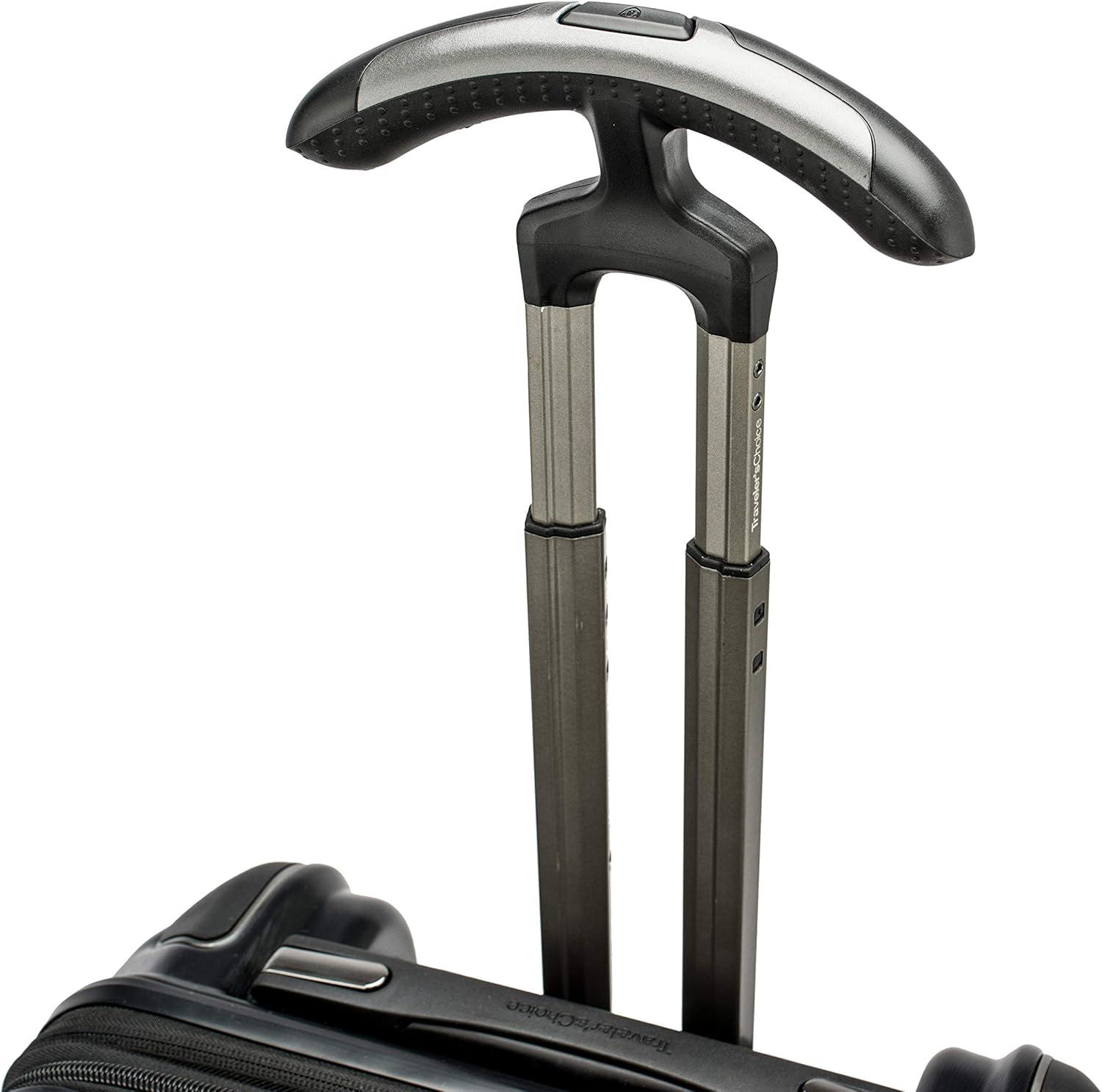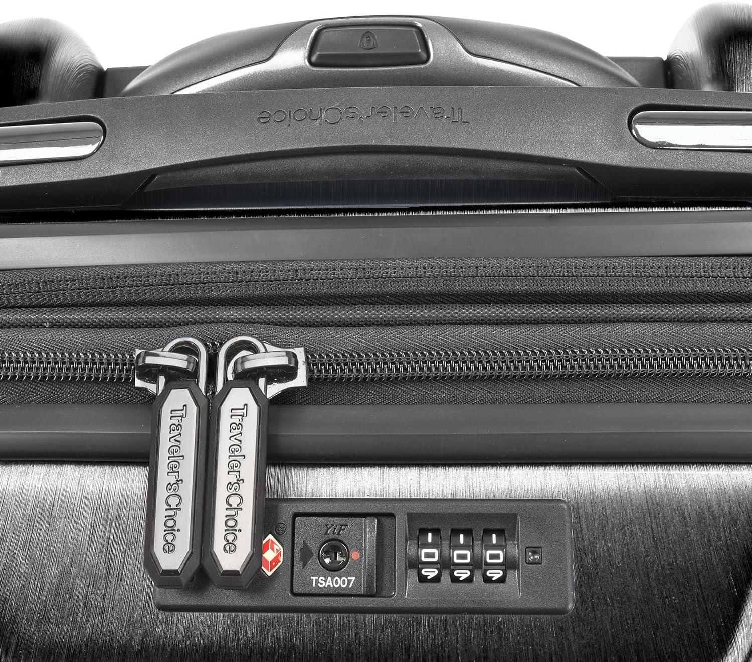 Made of 100% polycarbonate hard-shell, which is the most durable material for hardside luggage. Unique diamond-cut texture finish prevents abrasive scratches and finger prints. Patent-pending T-Cruiser handle system allows you to maneuver your bag with ease. The downward curve of the handle fits the natural position of your hand, thereby minimizing discomfort or fatigue. The double tubes of the handle system maximize the interior space for packing and still allow for a 2nd bag to be carried on top. The push-button mechanism and multi-stage locking feature allows you to adjust the height of the handle to maximize comfort. Patented Dual Cyclone Spherical spinner wheel system provides wide wheel bases for better traction and stability. Each wheel features a 5mm shock-resistant material that assures smooth maneuverability and quiet rolling experience. Each half of the Dual Cyclone wheel can move independently in the same or opposite direction, allowing you to roll or spin your suitcase effortlessly over uneven and smooth surfaces. The four multi-directional Dual Cyclone wheels allow the suitcase to roll upright, so there’s no weight on your arm or shoulder. Expansion gusset boosts extra packing capacity by 25%. Top, side and bottom carry handles for easy lifting. Riveted corner guards enhance overall durability. Imprinted fully-lined interior with two center dividers. Built-in TSA-approved combination lock offers extra security. 21” carry-on spinner features a built-in USB port and interior power bank compartment that provide quick connection to your portable electronic device for a quick charge. Power bank compartment measures 9”W x 4”L x 1”D. (Power bank not provided) Industry-leading Traveler’s Choice quality is backed by a 10-year manufacturer’s warranty. 21” SPINNER UPRIGHT Exterior Dimensions: 21”H x 14”W x 9.5” (+2”) D (8.2lbs) Interior Dimensions: 19.75”H x 13.75”W x 9.25” (+2”)