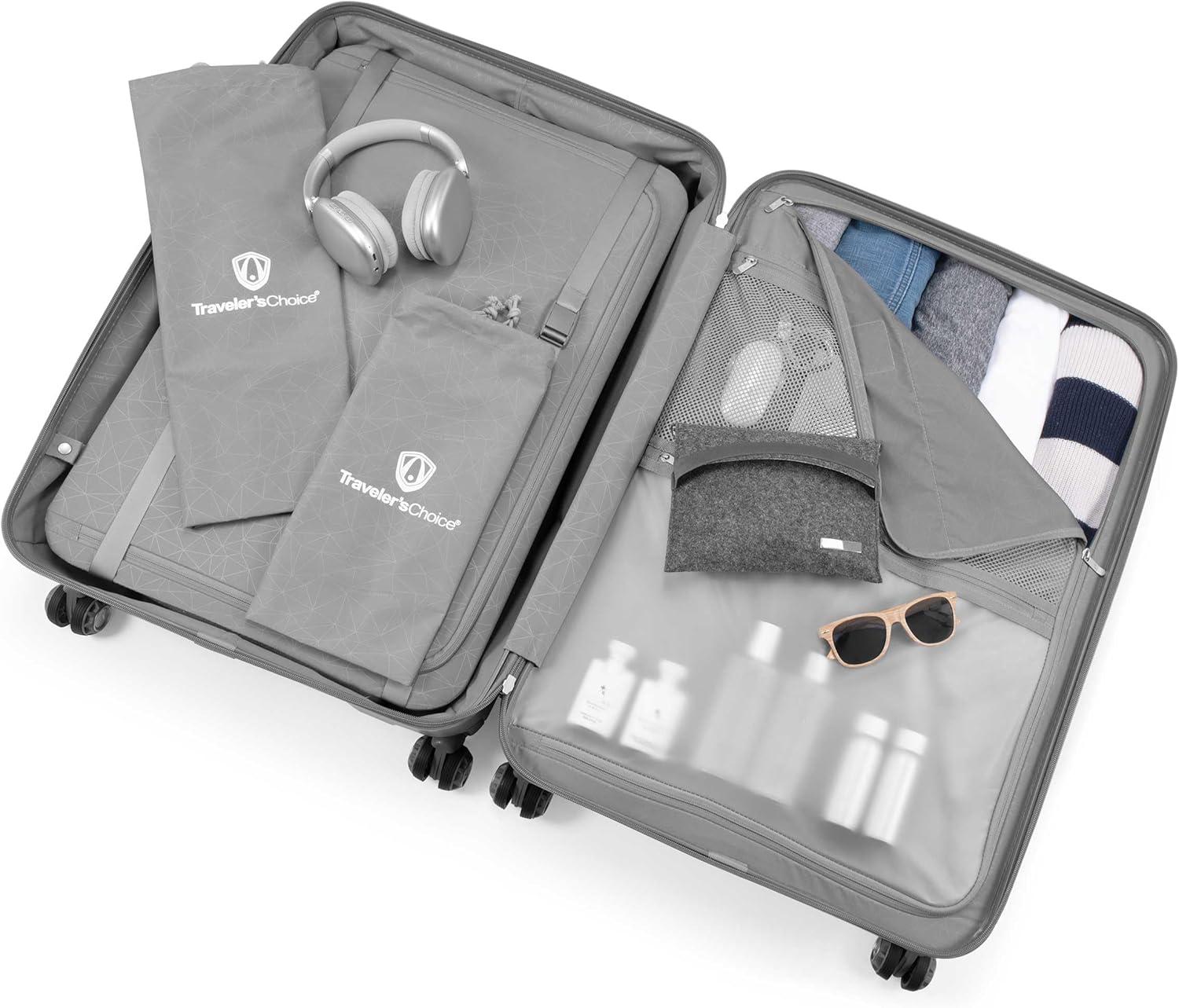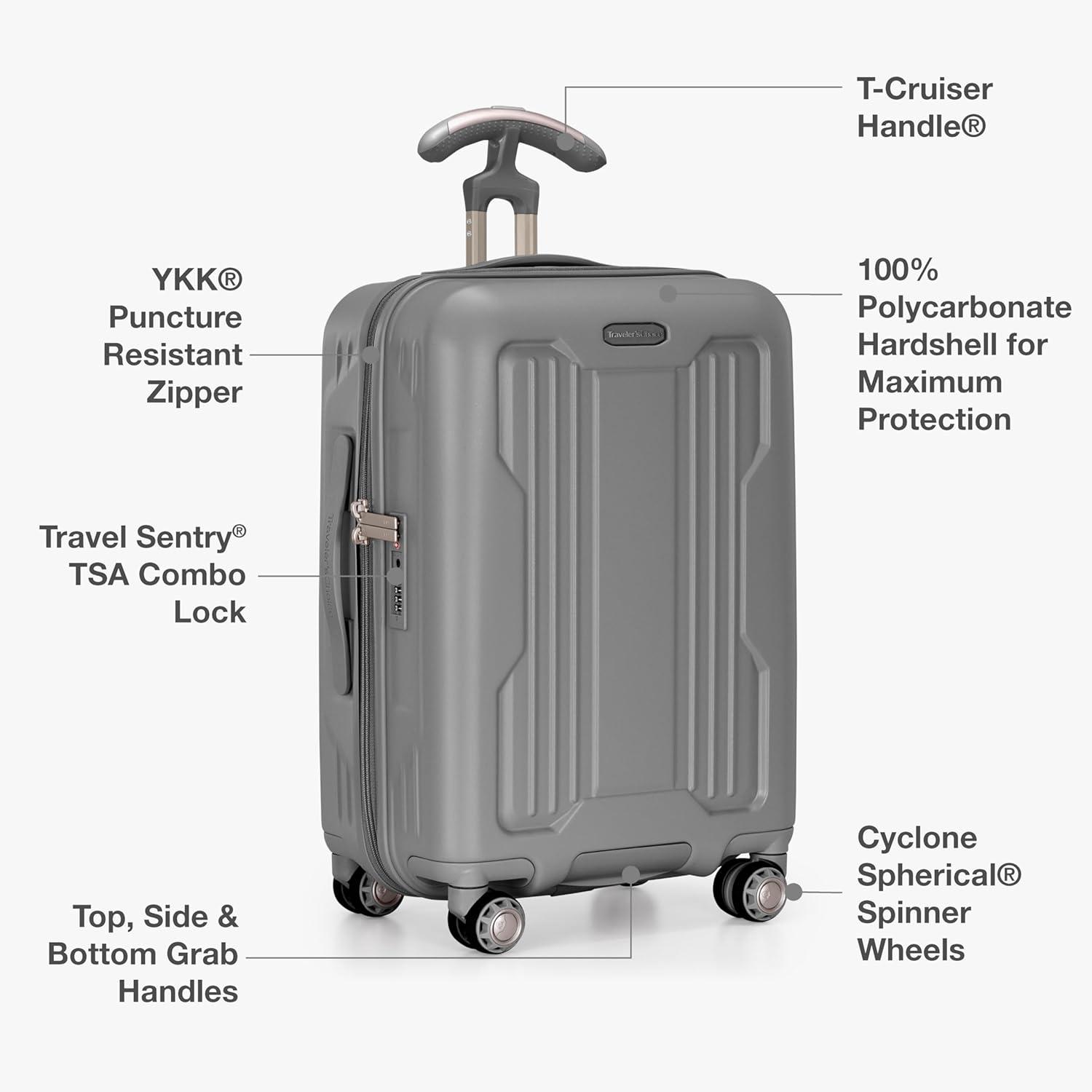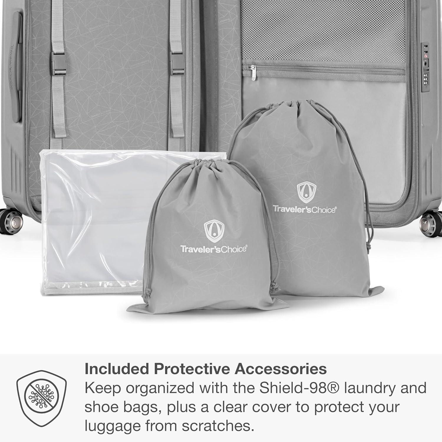 Make packing and traveling effortless with the Traveler's Choice Ultimax II Luggage Collection, designed for international travel and built for today’s modern traveler. Crafted from a durable 100% polycarbonate hard shell, this luggage offers maximum impact protection during transit. The upgraded Cyclone Spherical® spinner wheel system with ball bearings ensures smooth, stable gliding while reducing friction, even on rough surfaces. Keep your belongings secure with a built-in TSA-approved combination lock and premium YKK® zippers for enhanced durability. Navigate tight spaces with ease using the patented T-Cruiser® handle system for ergonomic control between tight spaces. Inside, the luggage is fully lined with Shield-98® protective fabric to keep it clean and fresh after each trip. A compression tie-down system and zippered divider maximize packing space and keep items organized. Separate dirty clothes with the included Shield-98® laundry bag and shoe pouch, and use the dedicated tracker pocket (tracker not included) for added peace of mind. Whether for a week-long getaway or overseas adventure, the Ultimax II delivers style, durability, and organization for every journey.