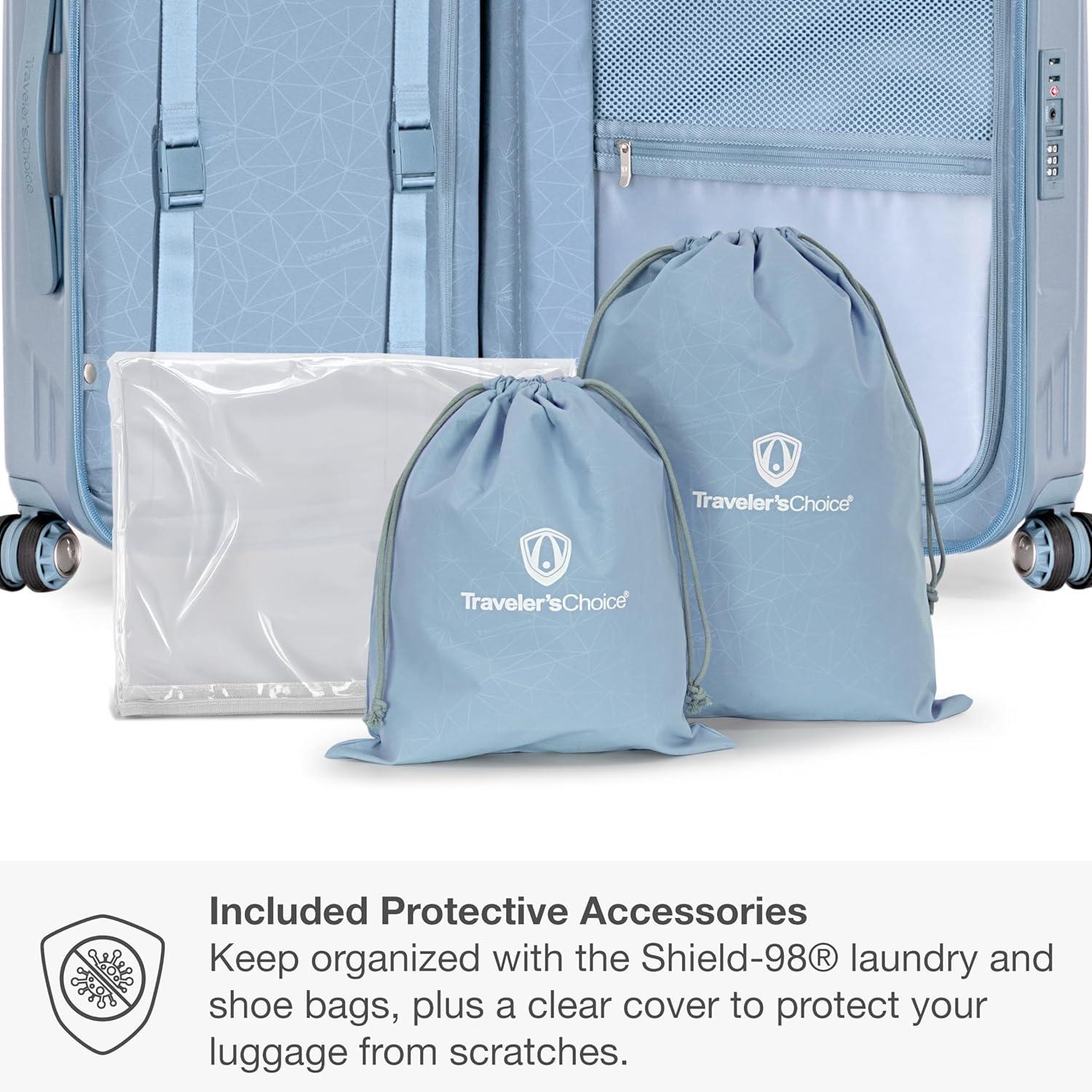 Make packing and traveling effortless with the Traveler's Choice Ultimax II Luggage Collection, designed for international travel and built for today’s modern traveler. Crafted from a durable 100% polycarbonate hard shell, this luggage offers maximum impact protection during transit. The upgraded Cyclone Spherical® spinner wheel system with ball bearings ensures smooth, stable gliding while reducing friction, even on rough surfaces. Keep your belongings secure with a built-in TSA-approved combination lock and premium YKK® zippers for enhanced durability. Navigate tight spaces with ease using the patented T-Cruiser® handle system for ergonomic control between tight spaces. Inside, the luggage is fully lined with Shield-98® protective fabric to keep it clean and fresh after each trip. A compression tie-down system and zippered divider maximize packing space and keep items organized. Separate dirty clothes with the included Shield-98® laundry bag and shoe pouch, and use the dedicated tracker pocket (tracker not included) for added peace of mind. Whether for a week-long getaway or overseas adventure, the Ultimax II delivers style, durability, and organization for every journey.