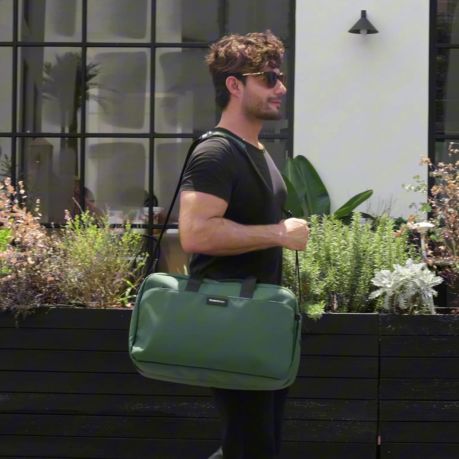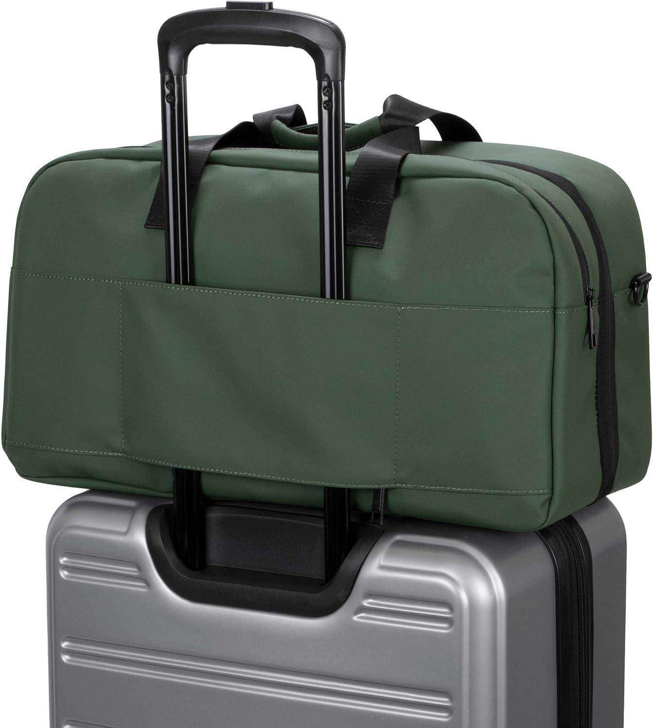 The Wanderbout is designed for modern traveler's in mind, taking the hassle out of packing for the weekend getaways or business trips. Crafted from water resistant Oxford fabric, this bag not only protects your electronics and belongings from rainy days or spills, but also offers long-lasting durability with its tightly woven, abrasion-resistant material designed to withstand daily wear and tear. The clamshell opening lets you pack and unpack like a suitcase, giving you full visibility without the need to rummage through your bag. Safeguard your electronics with a dedicated padded sleeve with a secure strap that keeps your tablet and laptop (up to 16-inches) snug and protected from bumps and drops. Conveniently carry the duffel multiple ways using the durable carry handle, removable padded shoulder strap, or go hands-free using the back luggage loop, allowing the duffle to slide your luggage handle through to take the weight off your arms for easy portability. The front zippered pocket features multiple interior organizers and a key leash, making it easy to access small essentials. The expandable side pocket securely holds a water bottle, keeping it secured and in place. Ready for every journey, the Wanderbout keeps your essentials organized, protected, and always within reach. Product Dimensions: 19″L x 11″H x 8.5″W. Weight: 2.80 lbs