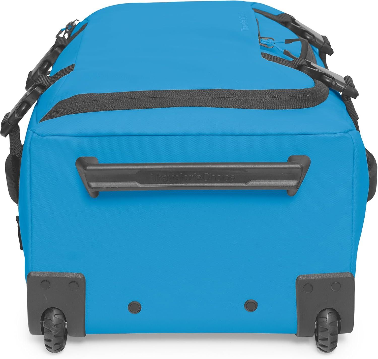 Embark on your next adventure with the Traveler's Choice Wendy Hill 21″ Carry-On Softside Wheeled Duffel Bag, perfect for a weekend getaway. Crafted from durable 600D PU-coated polyester, this sporty carry-on offers superior protection for your belongings. Effortlessly navigate through airports with smooth-rolling inline skate wheels and a telescopic handle featuring a push-button lock for easy height adjustment. The spacious main compartment is easily accessible through a large U-shaped front opening, while the fully lined interior includes a zippered mesh pocket and tie-down straps to keep your essentials secure and organized. Convenient exterior pockets provide quick access to last-minute items and souvenirs. Buckle up the compression straps and get ready for any adventure with Traveler's Choice Wendy Hill upright wheeled duffel.